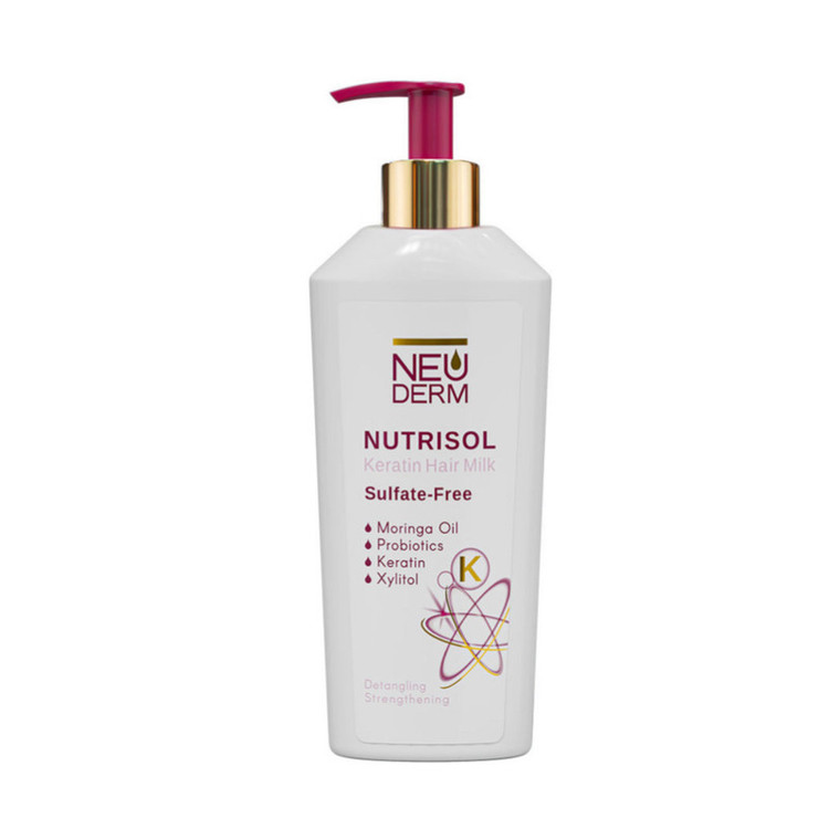 این محصول ضمن تقویت و تغذیه رشتههای مو، باعث تثبیت رنگ، از بین رفتن زبری و وزی مو، احیای نرمی و لطافت و بازگرداندن حس شادابی و نشاط به موها میشود. کراتین پروتئینی است که موها را ترمیم میکند و با تقویت آن از موها در برابر شکستگی، آسیبهای حرارتی (براشینگ) و وز شدن آن محافظت میکند. روغن مورینگا مملو از ماده معدنی روی است که سبب تولید کراتین میشود و به تقویت، محافظت و مرطوب کنندگی موها کمک میکند. این روغن تغذیه کننده، آبرسان و نرم کننده مو و ضد التهاب پوست کف سر است. زایلیتول مرطوب کننده و ترمیم کننده عمقی موها است و با خاصیت نرم کنندگی، باعث آبرسانی و بهبود فوری خشکی موها، بهبود حالت پذیری و درخشندگی آنها میشود. پروتئین شیر تغذیه کننده، تقویت کننده و آبرسان موها است. این ماده نقش مؤثری درافزایش حالت پذیری، رطوبت، الاستیسیته و حجم دهندگی موها دارد. پروبیوتیک ها تقویت کننده و آبرسان مو است و مانند واکسن، سیستم ایمنى سلولى را فعال کرده و با تولید مواد ضد التهابى، با حفظ اسیدیته پوست و مو به بهبود وضعیت آنها کمک مىکنند. شیر مو کراتین این برند محصولی برای درمان موهای آسیب دیده و جلوگیری از وزی موها است.