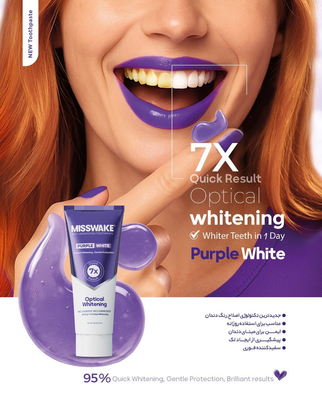 بسیاری از محصولات سفید کننده تنها بر پایه مواد ساینده یا سفید کنندههای موقت عمل میکنند که ممکن است به مینای دندان آسیب بزنند یا نتیجهای زودگذر داشته باشند. اما خمیر دندان ضد زردی میسویک مدل Purple white با ترکیب دقیق مواد تمیز کننده ملایم، فناوری تصحیح رنگ و عامل ضد باکتری، نه تنها دندانها را به طور واقعی سفید میکند، بلکه از سلامت آنها نیز محافظت مینماید. خمیر دندان purple white میسویک به جای پوشاندن لکها، آنها را به طور موثر پاک نموده و رنگ طبیعی دندانها را بازیابی میکند. از همه مهمتر، حس تازگی و تمیزی بعد از استفاده تا ساعتها باقی میماند، بدون آنکه باعث حساسیت یا سوزش شود.