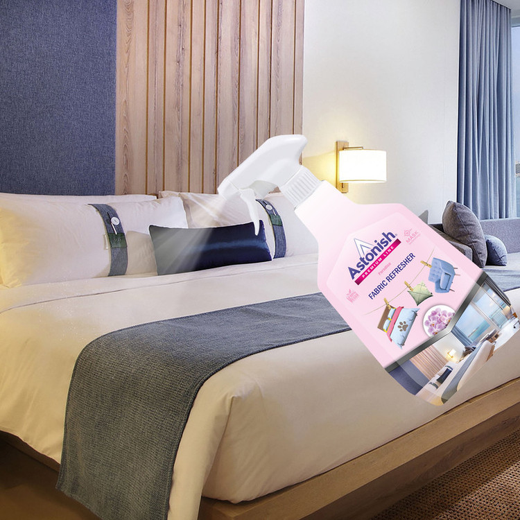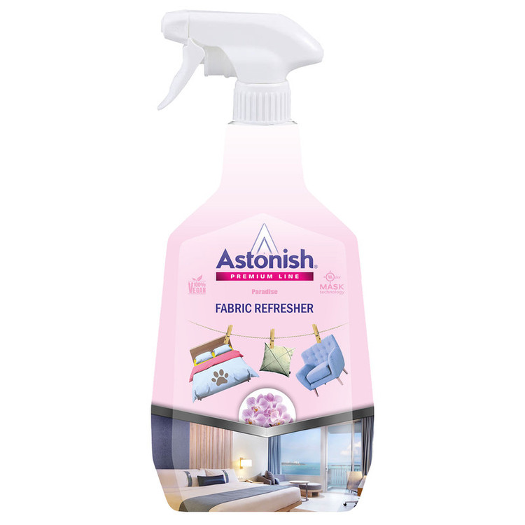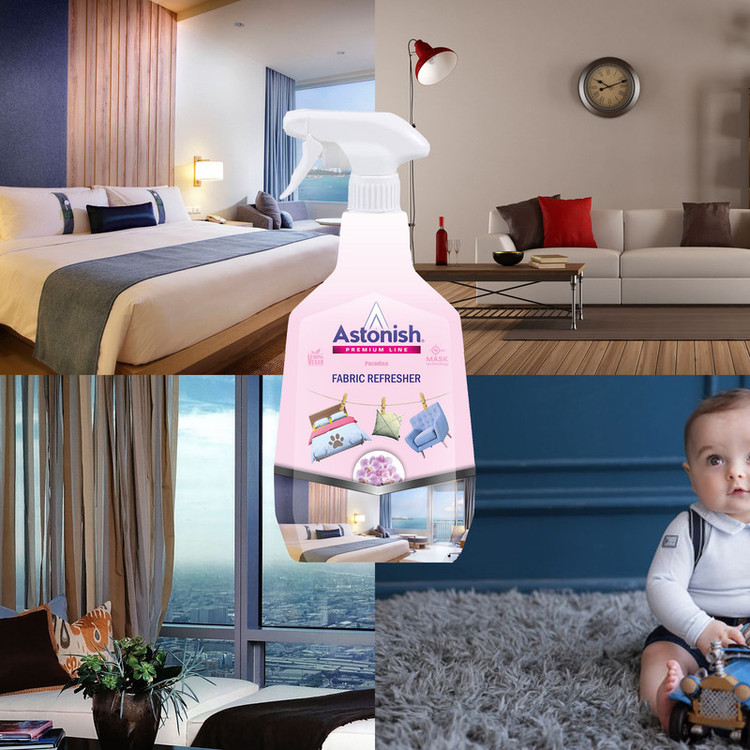 خوشبو کننده و بو زدا پارچه و هوا: انتشار متداول بوهای نامطبوع مانند بوی سیگار، پخت و پز، تعریق، رطوبت، حیوانات خانگی و ... و جذب مولکولی روی سطوح پارچه ای محل کار و خانه مانند مبلمان، فرش، سرویس خواب، پرده، صندلی خودرو، البسه و تثبیت آن روی سطوح پارچه ای ، فضایی ناخوشایند را در محیط زندگی و کار بوجود می آورد که انرژی محیط را می گیرد. برند آستونیش محصولی به نام خوشبوکننده و بو زدا پارچه و هوا (Fabric Refresher) با حجم 750 میلی لیتر را به بازار عرضه کرده است که با بکار گیری تکنولوژی های میکرو کپسوله (Encapsulation) و تخریب ساختار مولکولی بو های مزاحم (Odor Mask) سطوح پارچه ای که امکان شستشوی مداوم ندارند را بو زدایی و خوشبو کرده و در حالت بعد از شستشو قرار میدهد که منجر به افزایش طول عمر مبلمان و فراهم کردن محیطی تمیز و خوشبو و پر انرژی با ایجاد حس تازگی در منزل و محل کار میگردد. - محل استفاده : روی پارچههایی که به سختی قابل شستشو هستند در سراسر خانهتان استفاده کنید، مانند فرش، مبلمان، اثاثه یا لوازم داخلی، ملافه، پرده، مبلمان خودرو، کمدهای لباس و کفش، کیفهای بدنسازی و تمامی محیط منزل و محل کار - روش استفاده : روی سطوح پارچه ای و مبلمان از فاصله 30 سانتیمتری اسپری کنید و رها کنید تا خشک شود. برای خوشبو کردن و بوزدایی هوا در محیط اسپری کنید