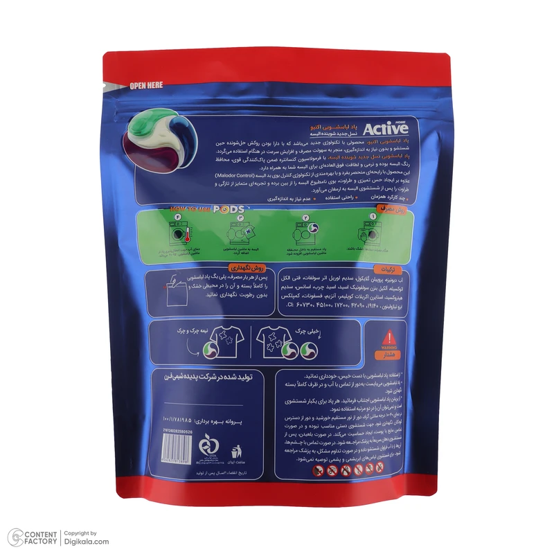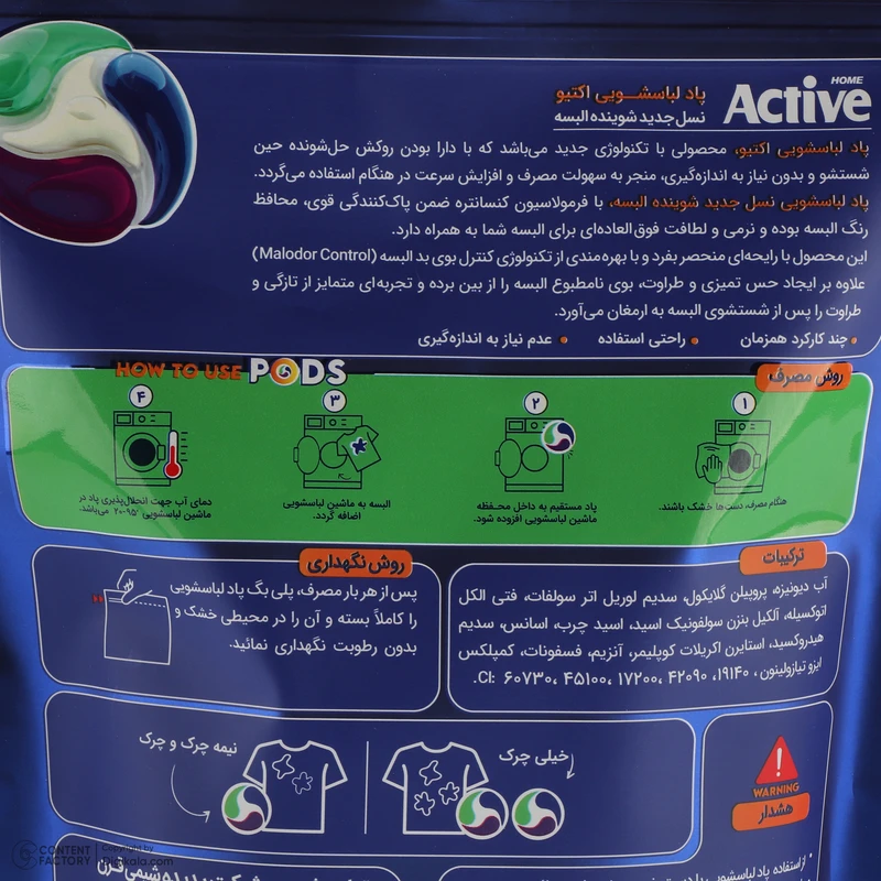 پادمایع ماشین لباسشویی اکتیو 👚شوینده لباس 👔 حفظ رنگ لباس 🥻 رایحه خوش 👕 نرم کننده لباس 👘 لکه بری بالا موارد مصرف: استفاده از این محصول برای انواع البسه امکانپذیر است. برای لباسهای ابریشمی و پشمی توصیه نمیشود. نقاط قوت محصول: چند کارکرد همزمان راحتی و سهولت استفاده عدم نیاز به اندازهگیری نیاز به کمترین فضا بستهبندی و نگهداری مناسب رایحه مطلوب و از بین برنده بوی نامطبوع وزن: 395 گرم رایحه: عطری هنگام مصرف، دستها خشک باشند. ابتدا پاد لباسشویی به داخل محفظه ماشین لباسشویی(درام استیل) انداخته شود. سپس لباسها به ماشین لباسشویی اضافه گردند. روش نگهداری پس از هر بار مصرف، پلی بگ پاد لباسشویی را کاملأ بسته و آن را در محیطی خشک و بدون رطوبت نگهداری نمائید. مراقبتها از استفادهی پاد لباسشویی با دست خیس، خودداری نمائید. پاد لباسشویی میبایست بدور از تماس با آب و در ظرف کاملأ بسته نگهداری شود. از بریدن پاد لباسشویی اجتناب فرمائید. هر پاد برای یکبار شستشوی است و نمیتوان آن را در دو مرتبه استفاده نمود. در دمای 40-10 درجه سانتی گراد، دور از نور مستقیم خورشید و دور از دسترس کودکان نگهداری شود. جهت استفاده شسشتوی دستی مناسب نمی باشد. در صورت بلعیدن، پس از شستشوی دهان سریعأ به پزشک مراجعه شود. در صورت تماس با چشم ها، آنها را با آب فراوان شستشو داده و در صورت تداوم مشکل، به پزشک مراجعه شود. برای لباسهای ابریشمی و پشمی توصیه نمیشود. پاد لباسشویی به عنوان محصولی جهت تغییر الگوی شستشوی البسه و نسل جدیدی از شوینده به بازار عرضه خواهد شد. هدف از تولید این محصول در درجهی اول استفاده از تکنولوژیهای جدید حوزه شوینده، کمک به محافظت از محیط زیست، افزایش سرعت شستشو و کاهش فضای اشغال شده میباشد. هر 4 رنگ این محصول دارای ویژگی منحصر بفردی می باشد که میتوان پاککنندگی فوقالعاده، لکهبری بالا، تثبیت رنگ البسه و نرمکنندگی فوقالعاده را نام برد. رایحه این محصول با بهرهمندی از دو تکنولوژی کنترل بوی بد البسه Malodor Control و ایجاد حس سرزندگی و آرامش WellBeingBoost در کنار محافظت از بافت البسه، تجربهای متمایز از تازگی و طراوت را پس از شستشوی البسه برای شما به ارمغان میآورد. استفاده از این دو تکنولوژی فوقالعاده رایحه در فرمولاسیون این محصول، باعث شده پس از هر بار شستشو با استشمام لباسها، حسی خوب و آرامش بخش ایجاد کند.