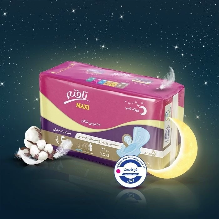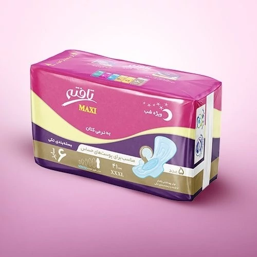 نوار بهداشتی ماکسی مشخصات: طول: 41 سانتیمتر (اندازه 6) ضخامت: نازک جنس رویه: لایه ترکیبی به نرمی کتان (Cotton Like Composite) بسته بندی: پنج عددی در بسته بندیهای تکی سه تا شده داخل پاکت پیشنهاد مصرف: مناسب استفاده در زمان استراحت طراحی: دارای چهار باله و دنباله پهنتر قدرت جذب: فوق العاده پروانه ساخت (غذا و دارو): 47/12086 شماره استاندارد: 8300857712 معرفی نوار بهداشتی ماکسی نوار بهداشتی ماکسی برند تافته نوعی از نوارهای بهداشتی است که برای جذب خونریزی بیشتر طراحی شدهاند. نوار بهداشتی ماکسی بزرگتر از نوار بهداشتیهای معمولی هستند. محصول معرفی شده با چهار بال و طول 41 سانتیمتر (اندازه 6) تولید میشود. این نوار بهداشتی در بستهبندیهای پنج عددی تکی سه تا شده داخل پاکت در بازار عرضه میشود. جنس و طراحی نوار بهداشتی ماکسی تافته نوار بهداشتی ماکسی از یکلایه ترکیبی به نرمی کتان (Cotton Like Composite) تولید شده است. این ویژگی به این محصول لطافت و نرمی بالایی بخشیده و موجب محبوبیت این نوع نوار بهداشتی است. نوار بهداشتی ماکسی دارای سطحی از منسوج نبافته بوده و در ساختار این نوار بهداشتی لایهای مشبک استفاده شده است. لایه مشبک به این محصول قدرت جذب بالا میبخشد و همین امر باعث میشود تا خونریزی به لباس نشت نکند. نوار بهداشتی ماکسی تافته دارای چهار باله و یک دنباله پهن است. اندازه بزرگ این نوار بهداشتی باعث میشود تا لباس و ملحفه از آلودهشدن محافظت شوند و این اطمینان خاطر را برای مصرفکننده به دنبال دارد.