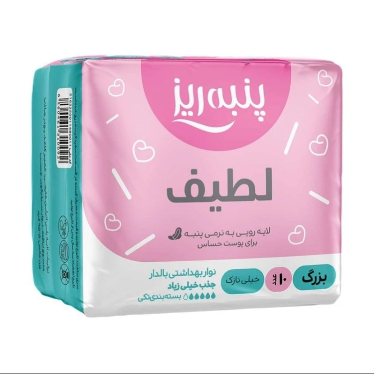 نوار بهداشتی روز و شب پنبه ریز مدل لطیف 10 عددی سایز لارج بسته بندی تکی، لفاف دار ضخامت خیلی نازک بالدار لایه رویی پنبه با جذب خیلی زیاد ضد حساسیت دارای چسب قوی و بالشتک های جذب کننده