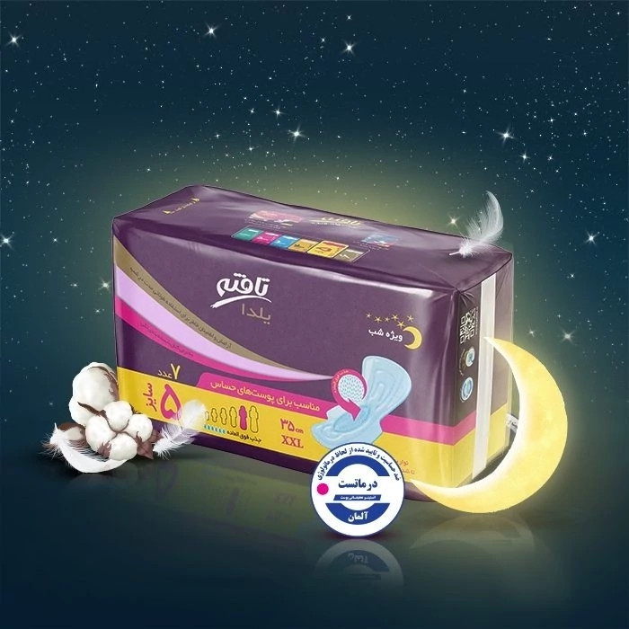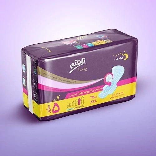 نوار بهداشتی یلدا مشخصات: طول: 35 سانتیمتر (سایز 5) ضخامت: نازک جنس رویه: لایه ترکیبی به نرمی کتان (Cotton Like Composite) بسته بندی: هفت عددی در بسته بندیهای تکی سه تا شده داخل پاکت پیشنهاد مصرف: مناسب استفاده در زمان استراحت طراحی: دارای چهار باله و دنباله پهنتر قدرت جذب: فوق العاده پروانه ساخت (غذا و دارو): 47/13468 شماره استاندارد: 8300857712