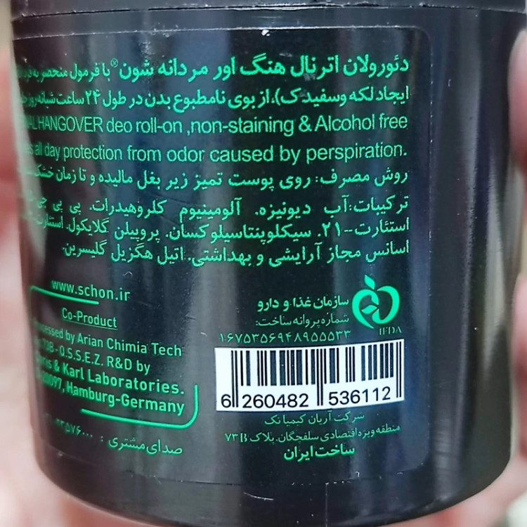 مام رول دئودورانت مردانه هنگ اور شون Schon Hangover Deorollon دئورولان اترنال هنگ اور شون با فرمول منحصر به فرد گیاهی، بدون الکل و بدون پارابن از تعریف و بوی نامطبوع بدن در طول 24 ساعت شبانه روز جلوگیری می کند. ❌لکه و سفیدک روی لباس باقی نمی گذارد. ❌بدون پارابن ❌بدون الکل ❌دارای سیب سلامت از سازمان غذا و دارو کشور