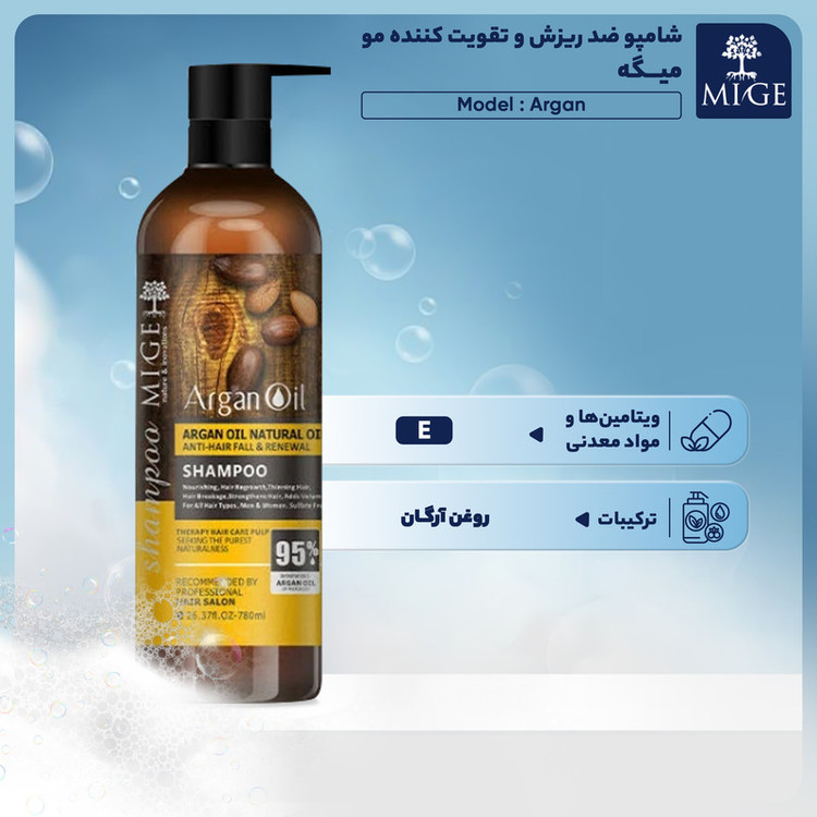 شامپو ضد ریزش و تقویت کننده مو میگه مدل آرگان، با آبرسانی و تغذیه عمقی موها، به بازسازی و تقویت آنها کمک میکند. فاقد پارابن و مواد مضر شیمیایی است و علاوه بر تثبیت کراتین، پروتئین و رنگ مو، به تنظیم چربی سر و جوانسازی موها نیز کمک میکند. حاوی روغن آرگان است که خواص ضد ریزش و ضد شوره دارد. این محصول بدون سولفات است و موها را نرم و ابریشمی میکند.