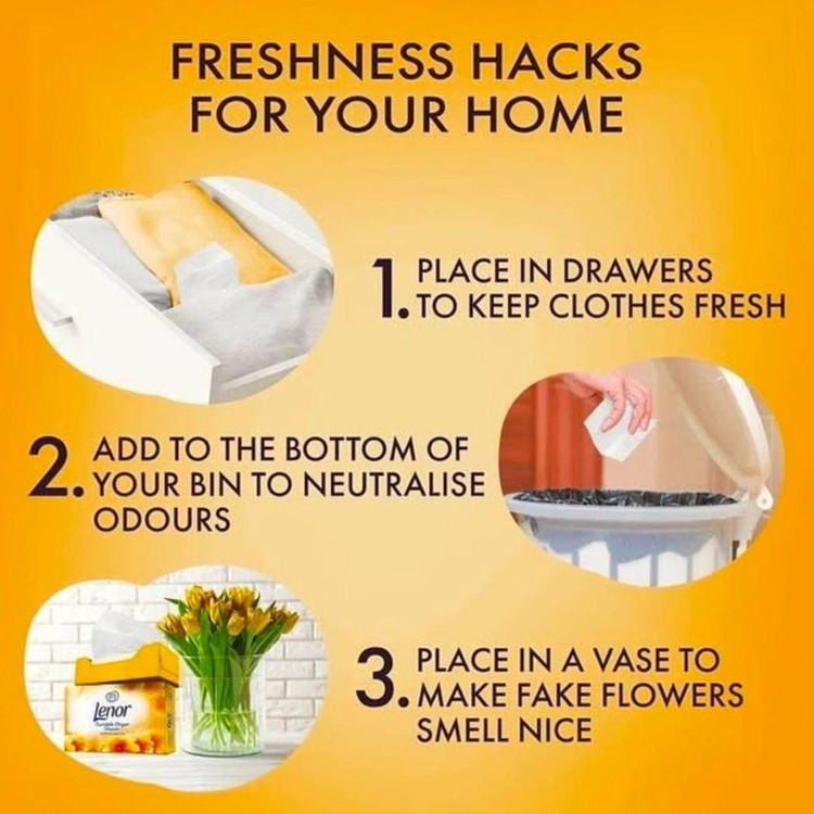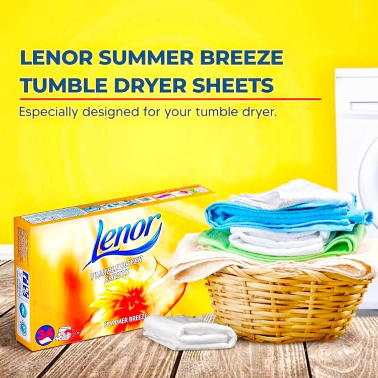 خوشبو کننده لباس و خشک کن لنور Lenor محصولی جدید و متفاوت است که 99 درصد مصرف کنندگان، آنرا به دوستان خود پیشنهاد داده اند. اگر پس از شستشوی لباسها در ماشین لباسشویی بوی نامطبوع لباسها و داخل ماشین لباسشویی شما را ناراحت میکند شما باید از این محصول استفاده کنید.با استفاده از این محصول لباسهای شما برای مدت طولانی خوشبو باقی میمانند و با رایحه دلپذیر تابستانی آغشته میشوند. این به این دلیل است که دستمال در ابتدای شستشو اجازه میدهند عطر بیشتری در حین شستشو به آرامی وارد پارچههای شما شود. یک عدد از دستمال ها را داخل لباسشویی هنگام خشک کن انداخته و سپس طبق روال عادی لباسها را خشک کنید و پس از باز کردن درب ماشین، شگفت زده شوید. این دستمال ها قابلیت استفاده در جاهای دیگر مانند داخل کمد ، چمدان ، جاکفشی ، کفش ، لا به لای رختخواب ، داخل خودرو و هر جایی که نیاز به خوشبوکننده دارد را دارد.