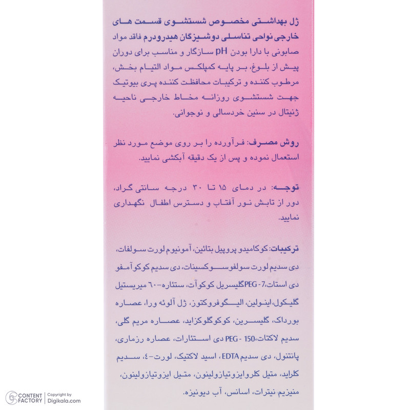 جهت شستشوی روزانه ناحیه ژنیتال خردسالان و دوشیزگان حاوی پری بیوتیک و pH سازگار دوران قبل از بلوغ فاقد مواد صابونی، الکل و پارابن رفع بوی نامطبوع
