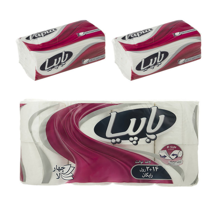 شامل 2 بسته دستمال کاغذی 250 برگ و یک بسته دستمال توالت 16 قلو