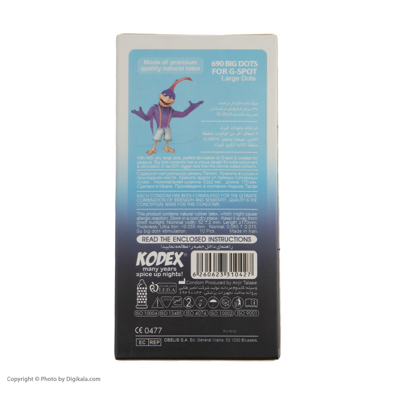 آغشته به ماده روان کننده دارای خارهای درشت در سراسر کاندوم دارای منبع ذخیره در ابتدای کاندوم کاملا ایمن