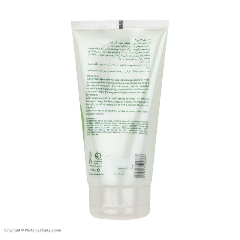 ماسک موی «شون» (Schon) با 150 میلیلیتر حجم حاوی عصارهی آووکادو است. از آنجایی که میوه آووکادو بسیار چرب محسوب میشود، عصارهی آن میتواند به لطافت و نرمی موهایتان کمک فراوانی کند. استفاده از محصولات حاوی عصارهی آووکادو بهویژه به کسانی که موهایی خشک و زبر دارند بسیار توصیه میشود. استفاده از عصارهی آووکادوی موجود در ماسک موی شون در مدت زمان بسیار کمی موهایتان را لطافت میبخشد و چربی مورد نیاز را به تارهای مو میرساند و مانع از خشکی و زبری موها میشود. همچنین شون خاصیت ترمیمکنندگی هم دارد و موهای آسیبدیده را بهبود میبخشد. موهای آسیبدیده را که در اثر رنگ کردن، فرکردن و استفاده از مواد شیمیایی مضر تخریب شدهاند و شادابی و لطافت خود را از دست دادهاند ترمیم و احیا میکند. شون باعث درخشش و براقی موها میشود و همین امر زیبایی موهایتان را چند برابر میکند. ماسک موی شون حاوی آنتیاکسیدانهای A، B، C، D و E است که هرکدام از این ویتامینها با خاصیتهای شگفتآوری که دارند تاثیری مثبت روی موها میگذارند. استفاده از ماسک موی شون الکتریسیته ساکن موهای شما را ازبین میبرد و مانع از ایجاد این حالت در موها میشود. شون محصول کشور ایران است و محصولات باکیفیت آن در اکثر داروخانهها و فروشگاههای آرایشی و بهداشتی بهفروش میرسد. شون دارای مجوز از سازمان غذا و دارو و از نظر بهداشتی کاملاً تایید شده است.
